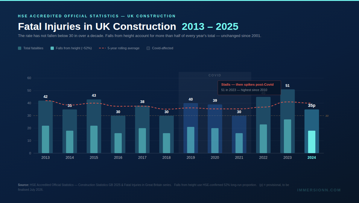 Construction has never been short of safety ambition. The volume of guidance, legislation, and investment directed at the problem over the past two decades is substantial. What that investment has not produced is a sustained reduction in the number of people who fall.